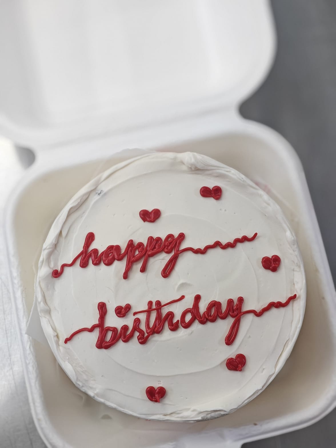 A beautifully minimal cake finished in smooth white frosting, accented with delicate red script and tiny heart details. Elegant, timeless, and effortlessly chic – perfect for intimate celebrations and those who love understated luxury.