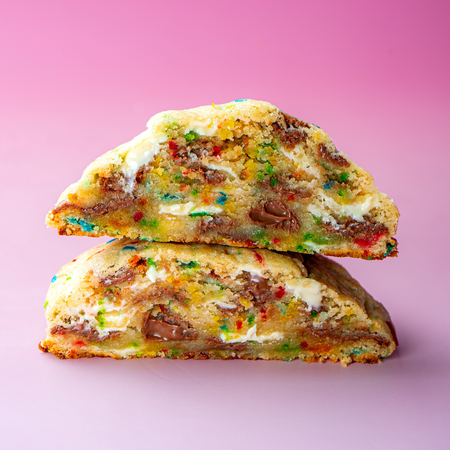 Thick cookie packed with rainbow sprinkles and creamy white & milk chocolate chips