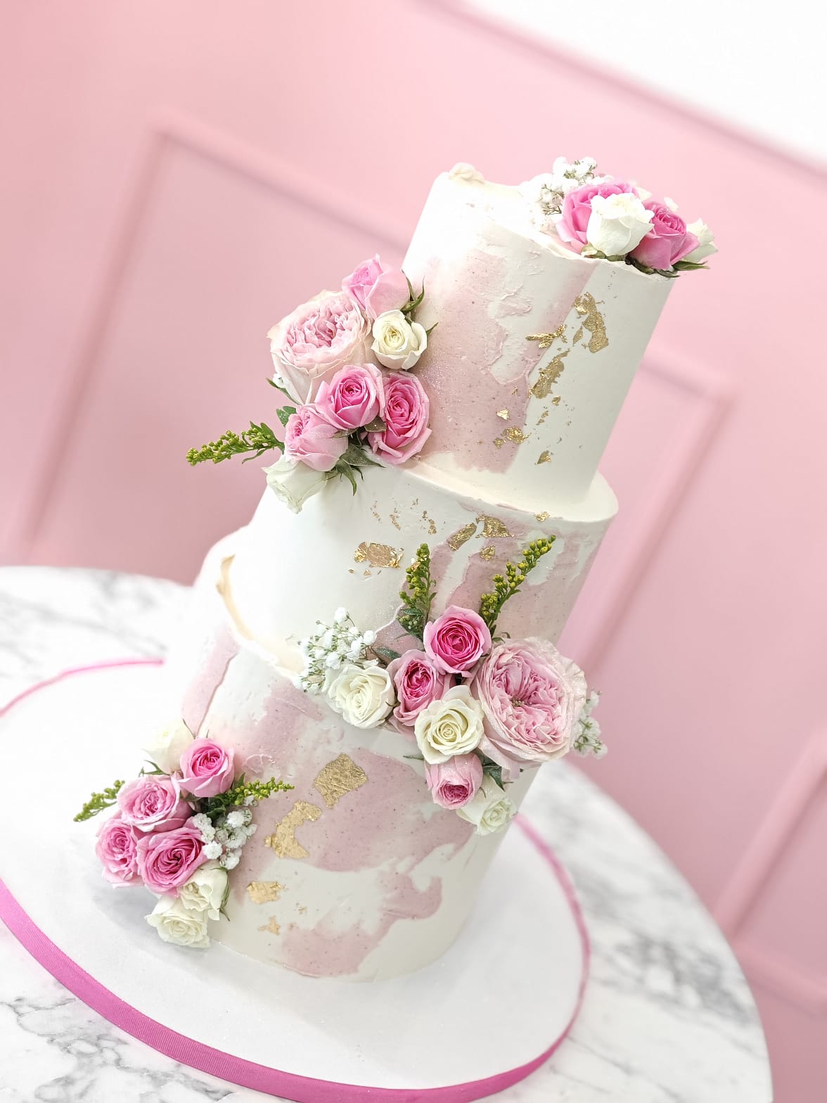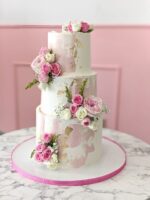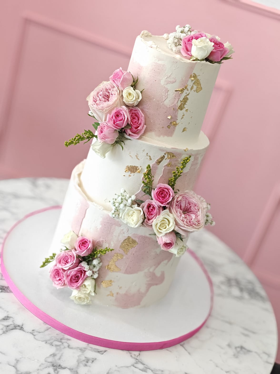 A luxurious multi-tier cake finished in soft blush and ivory tones, accented with delicate gold leaf textures and adorned with fresh, hand-placed roses. Designed with an artistic, semi-textured finish, this cake exudes timeless elegance and sophistication.