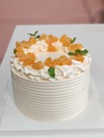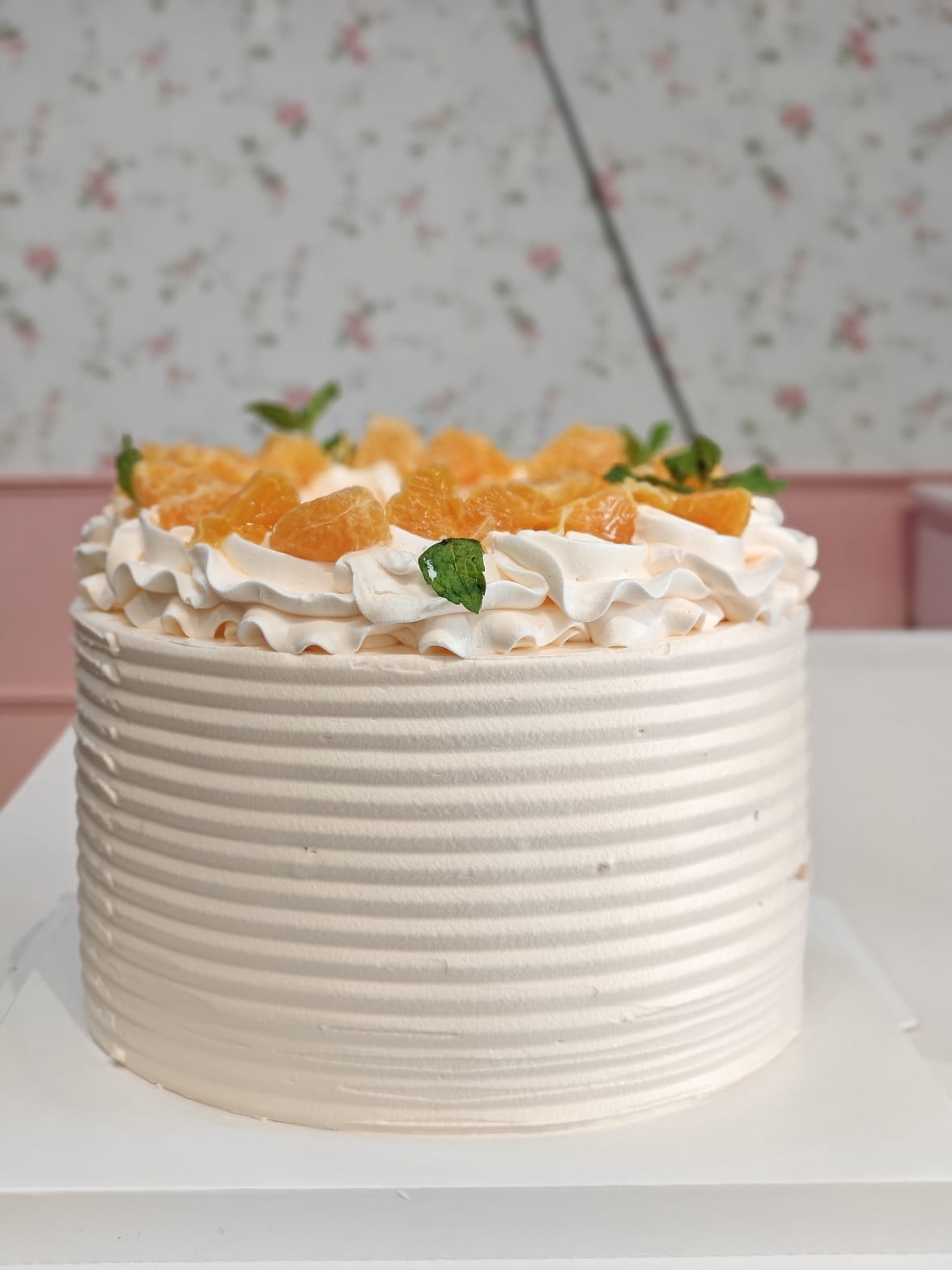 An ultra-light and airy chiffon sponge layered with silky fresh cream, finished with elegant piping and topped with juicy mandarine segments and fresh mint. Delicately balanced, this cake offers a refreshing citrus flavour with a soft, melt-in-the-mouth texture – perfect for those who love light and refined desserts.