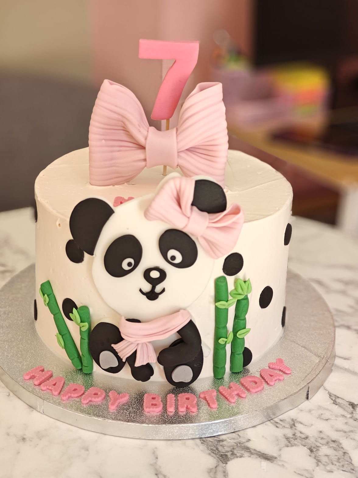An adorable panda-themed cake featuring a charming fondant panda, soft pink bows, and playful polka dots – perfect for little girls’ birthdays. Finished with delicate detailing and a sweet, joyful vibe that makes every celebration extra special.