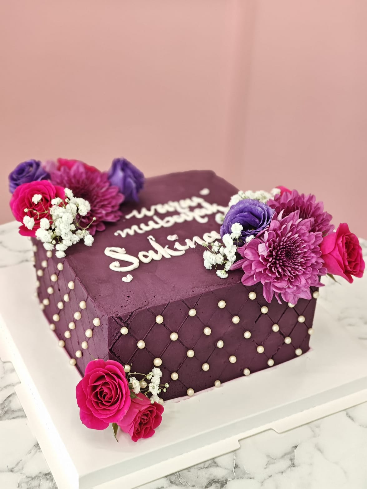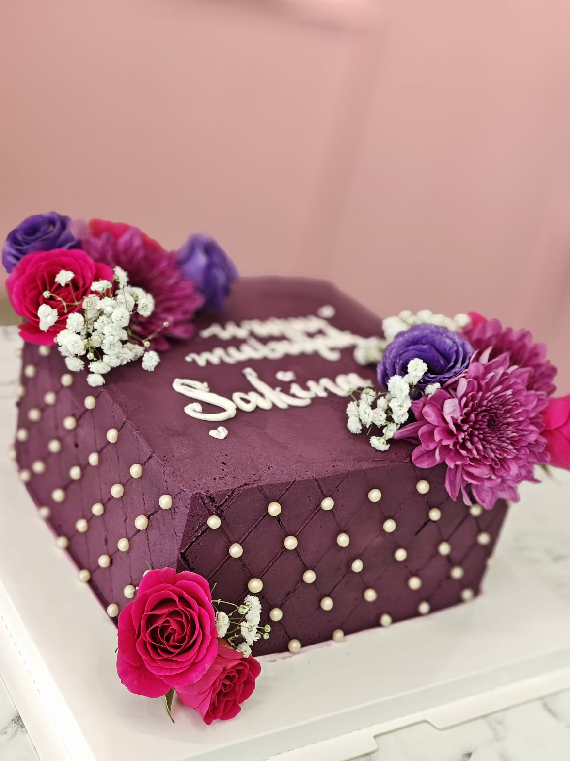 A luxurious heart-shaped cake finished in rich tones, detailed with delicate quilted texture and pearl accents. Adorned with fresh florals in vibrant hues, this design beautifully blends romance and sophistication – perfect for birthdays, anniversaries, and heartfelt celebrations.