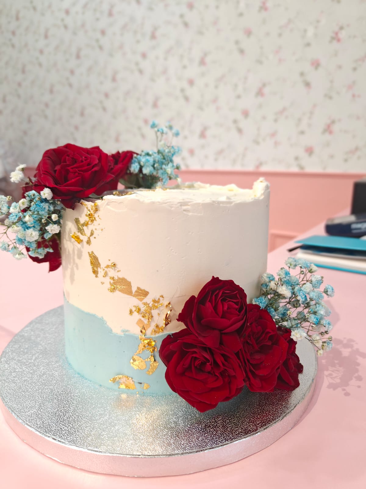 A beautifully balanced cake featuring soft dual tones, accented with delicate gold leaf detailing and fresh floral arrangements for a refined and graceful finish. Perfect for elegant celebrations and special moments.