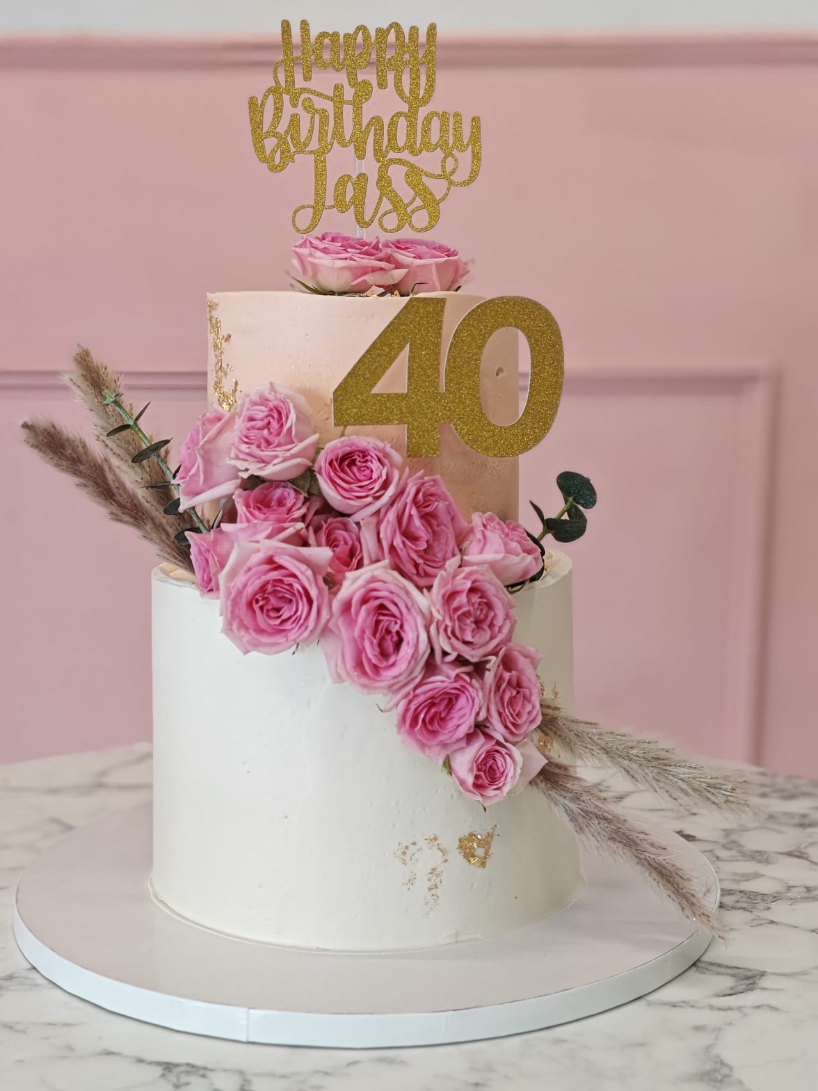 A sophisticated two-tier cake designed for milestone celebrations, featuring a smooth ivory finish, delicate gold accents, and a graceful arrangement of fresh roses. Paired with a bold number topper, this cake creates a luxurious and memorable centerpiece for special birthdays.