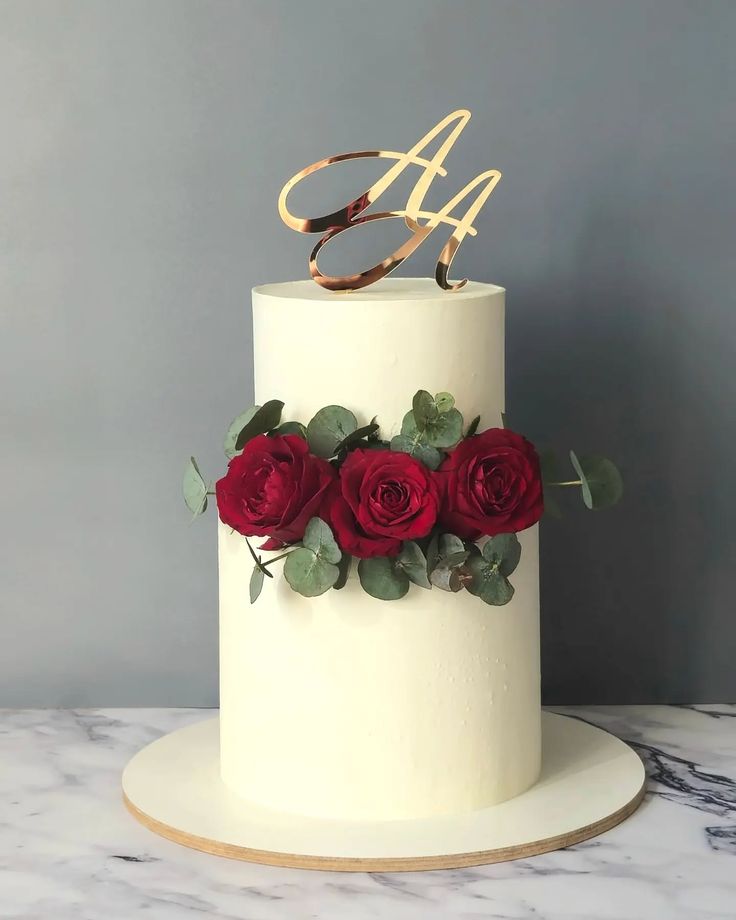 A sophisticated, minimal cake finished with a smooth, flawless cream surface and adorned with a delicate arrangement of fresh red roses and eucalyptus leaves. Topped with a personalized rose gold initial topper, this design exudes timeless elegance and luxury. Perfect for anniversaries, engagements, or intimate celebrations that call for a refined and graceful centerpiece.
