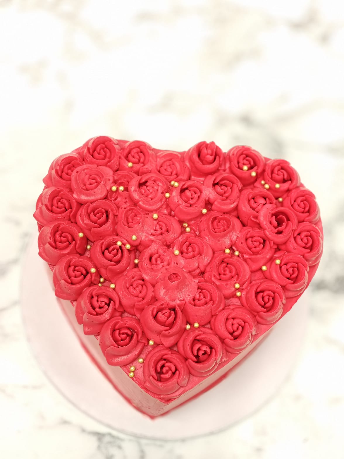 A beautifully crafted heart-shaped cake topped with delicate hand-piped rosettes in a rich, vibrant finish, accented with subtle golden pearls. Designed to express love and elegance, this cake is perfect for anniversaries, romantic celebrations, and special moments.
