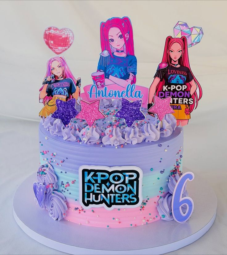 A vibrant, show-stopping cake inspired by the world of K-Pop, featuring bold character toppers, playful colors, and sparkling accents. Designed with a trendy pastel base, glitter stars, and personalized name detailing, making it perfect for young K-Pop fans.