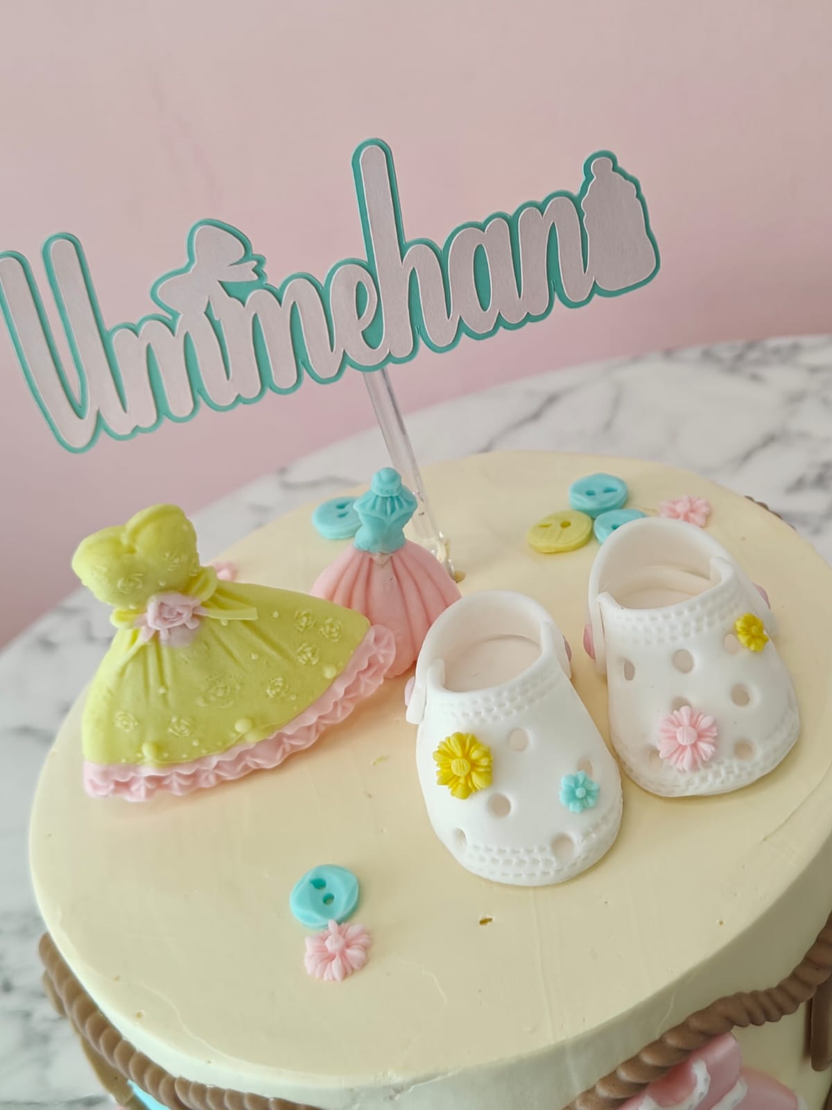 A charming and intricately designed cake inspired by a little princess’s wardrobe, featuring handcrafted fondant dresses, baby shoes, and delicate details in soft pastel tones. Finished with a personalized topper and elegant textures, this cake creates a magical centerpiece for your child’s special celebration.