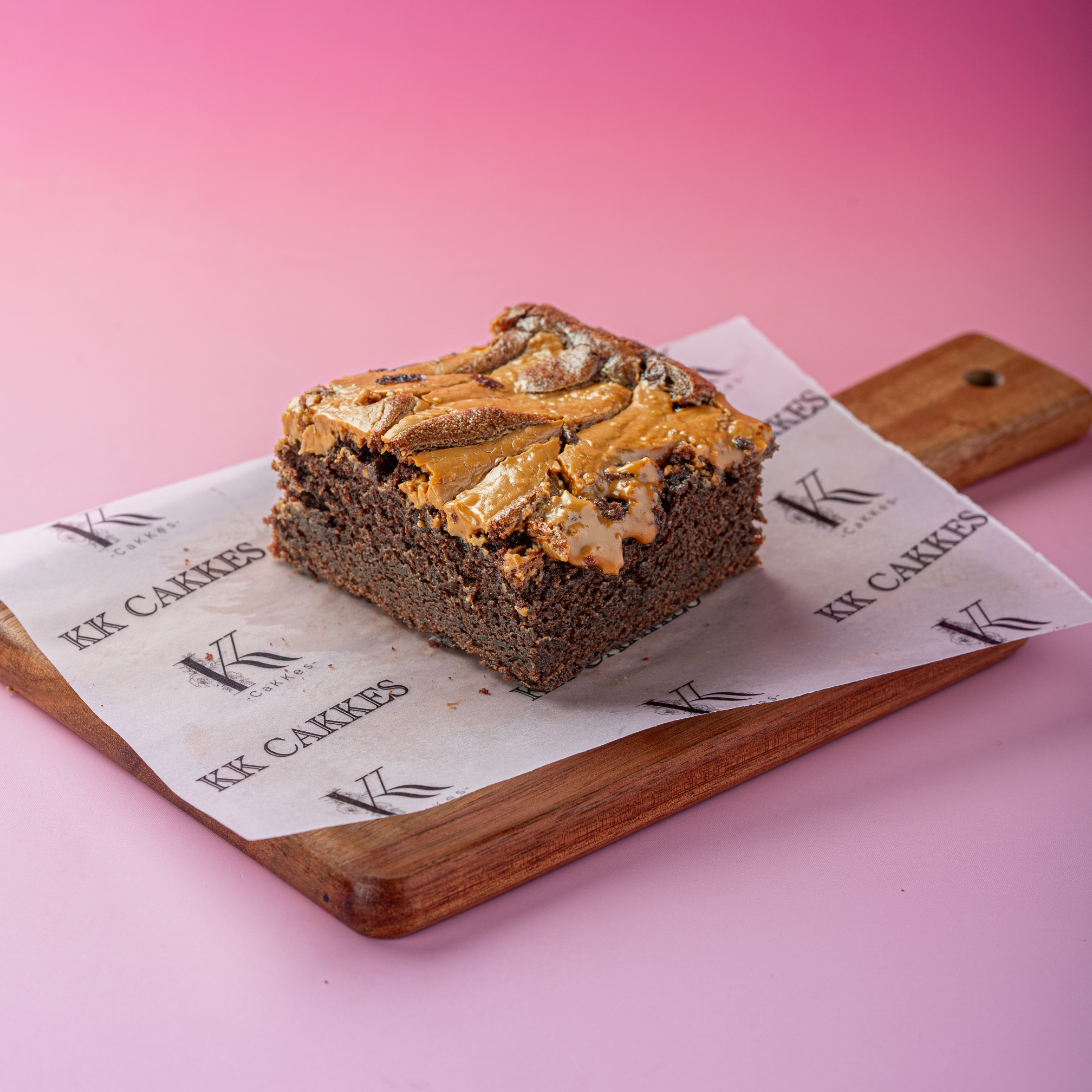 Gooey belgium chocolate brownie topped with smooth lotus spread and caramelisd crunchy biscuits