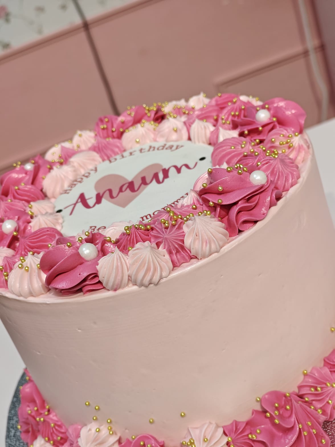 A beautifully crafted cake featuring soft blush tones with delicate rosette piping in shades of pink, finished with golden pearls and a personalized center message. Simple yet elegant, this design brings a perfect balance of charm and celebration.