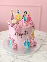 A dreamy pastel cake adorned with beloved princess characters, delicate rosettes, and soft floral accents, creating a magical fairytale design. Perfectly crafted for little princess birthdays, this cake brings charm, colour, and joy to every celebration.