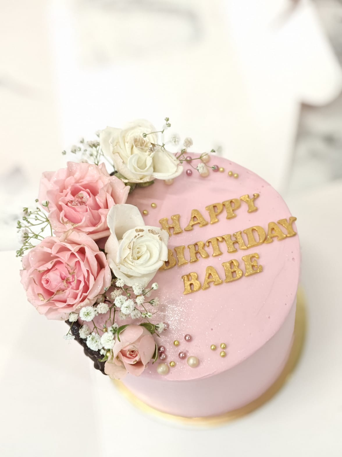 A soft pink cake adorned with delicate fresh roses, elegant floral accents, and subtle golden detailing, creating a truly romantic and graceful design. Perfect for birthdays, anniversaries, or heartfelt celebrations, this cake blends beauty with a refined, luxurious touch.