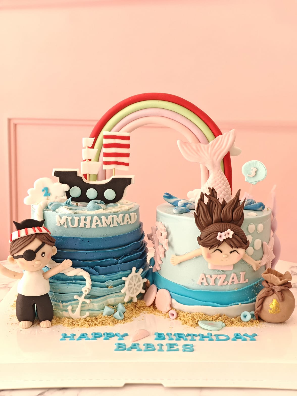 A beautifully crafted two-tier style cake designed to celebrate double the joy, featuring charming character details and playful themed elements. With soft pastel tones, ocean-inspired accents, and personalised touches, this cake is perfect for twin birthdays and special milestone celebrations.